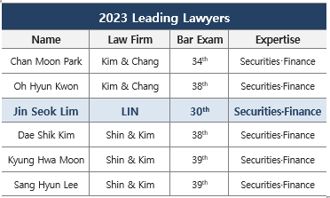 Lin’s Managing Partner Jin Seok Lim (Judicial Research and Training Institute of the Supreme Court of Korea (20th)), has been recognized as a Leading Lawyer in the “Securities & Finance” sector in the October issue of Legal Times' 2023 Special Edition.