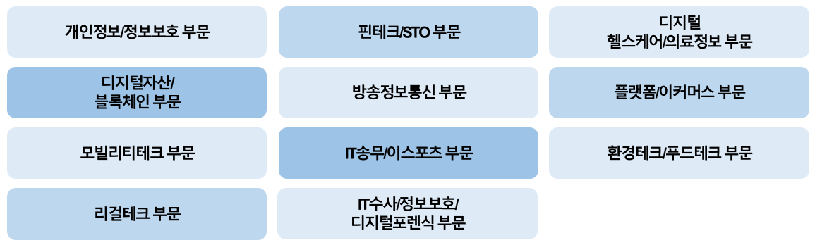 TMT·정보보호팀은 정보통신(Telecom), 개인정보보호(Privacy), 정보보호(Information Security), 핀테크(Fintech), 디지털 헬스케어(Digital Healthcare), 블록체인(Blockchain), 가상자산(VASP, Cryptocurrency), 스타트업(Startups), 규제샌드박스, 프롭테크(Proptech), 전자상거래(e-Commerce), 푸드테크(Foodtech), 인공지능(AI), 리걸테크(Legaltech), 이스포츠(e-Sports), 마인드스포츠(Mind Sports), 컴플라이언스(Compliance), 디지털 포렌식(Digital Forensics), 돈세탁방지(AML), 공유경제(Sharing Economy), 모빌리티테크(Mobilitytech) 분야를 중심으로 새 시대의 흐름을 주도하는 혁신가들을 위한 법률서비스를 제공합니다.