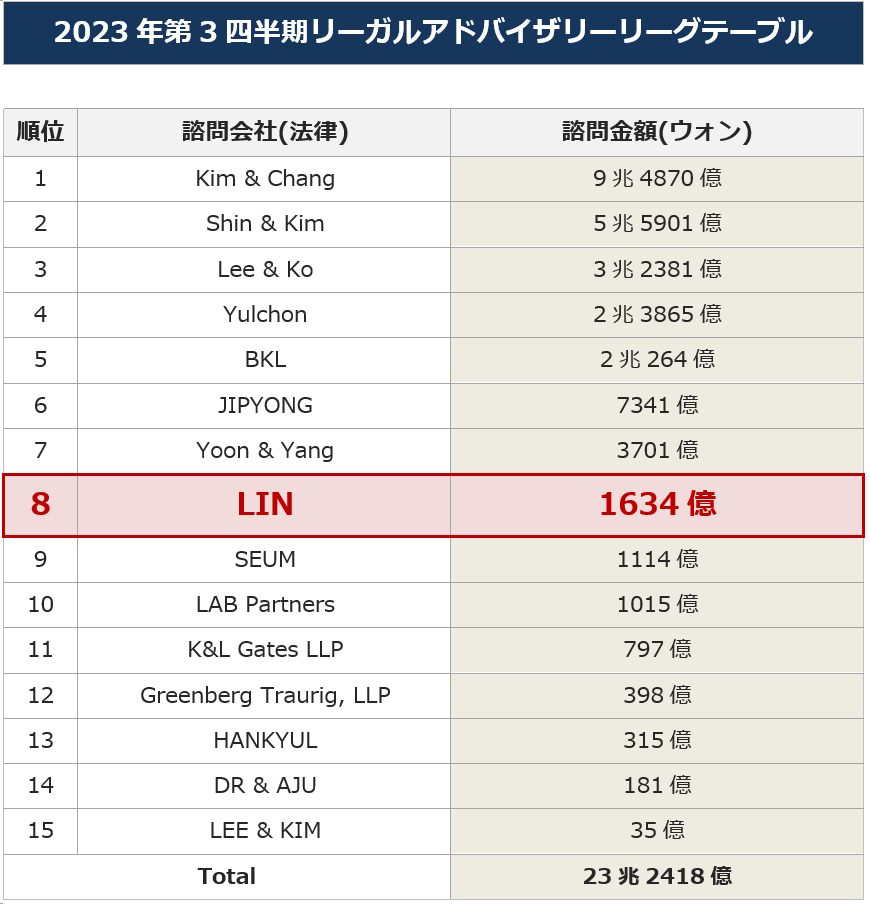 これは、米国の緊縮的な金融政策、OPECの減産などグローバル経済の悪材料が重なり、相次ぐ金利引き上げと景気の不確実性が続き、国内M&A市場が2年ぶりに5分の1規模に急減した市場状況の中で成し遂げた貴重な成果です。金&張、広場、世宗、太平洋及び律村出身のパートナーが率いる「麟(LIN)」のM&Aチームの専門性と豊富な経験及びPEから大企業を網羅する顧客のニーズに対する深い理解が市場から認められたという点で、法曹市場から大きな脚光を浴びています。