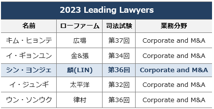 ローファームで活動する弁護士の業務専門化がますます細分化され、専門性が一層深化している中、法律専門誌リーガルタイムズは、このような傾向を反映して韓国の企業法務の専門弁護士を IP、TMT、証券・金融、Corporate and M&Aなど13の分野にわたって「2023韓国のリーディング・ローヤーズ(Leading Lawyers 2023)」に選定しています。