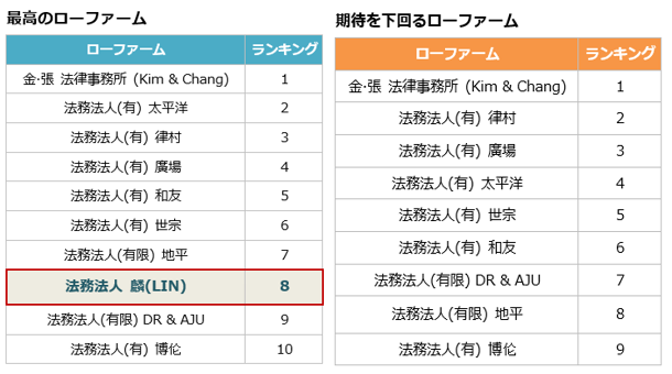 また、Kim & Changなど大手ローファーム出身の企業法務専門家らが所属している法務法人 麟(LIN)は、Kim & Changと同様のサービスをはるかに安価に提供していることをアピールしており、今回のアンケートにある「適正な弁護士費用」の質問で、すべてのローファームを含めて唯一5点満点を獲得し、高品質な法律サービスを合理的な価格で提供していることを証明しました。