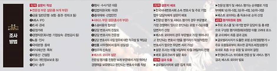 アンケートには約2100人が答えた。彼らが書いた回答を基に点数を付け、その結果を「評価委員会」(高麗大学ロースクールイ・ファン院長など6人)で検討した。評価委員会では、主要ローファームが提出した公的調査書を確認して定性評価を行った。名前や所属などが不明確な回答はすべて除外し、最終順位を決定した。