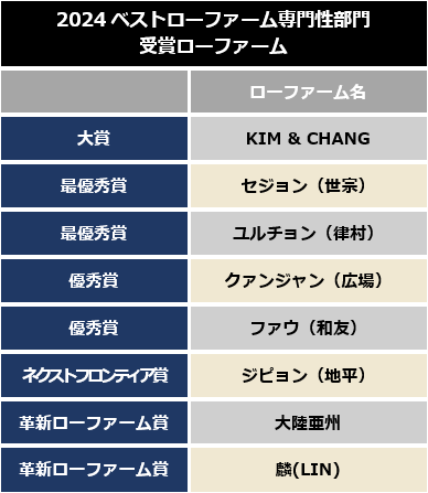 韓経ビジネスと韓国経済新聞、韓国社内弁護士会が選定する「大韓民国ベストローファーム&ロイヤー」は、ローファームの実需者である社内弁護士と企業法務担当者を対象に毎年実施する調査である。2010年に始まり、今年で15回目を迎えた。
