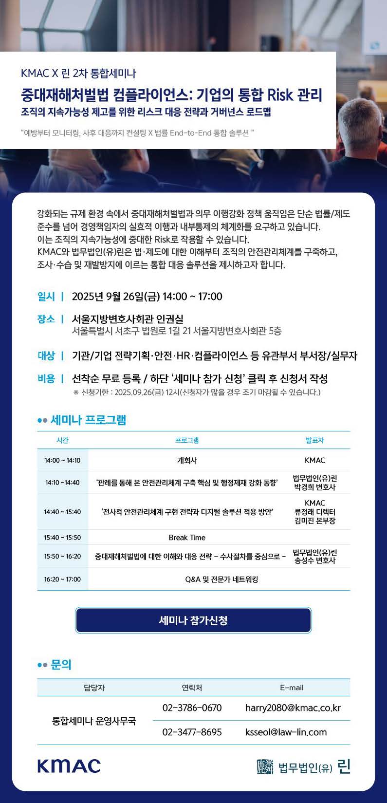 법무법인(유) 린은 한국능률협회컨설팅(KMAC)과 공동으로 9월 26일 서울지방변호사회관에서 '중대재해처벌법 컴플라이언스: 기업의 통합 Risk 관리' 주제의 세미나를 개최할 예정입니다. 이번 세미나는 ▲판례를 통해 본 안전관리체계 구축 핵심 및 행정제재 강화 동향 ▲전사적 안전관리체계 구현 전략과 디지털 솔루션 적용 방안 ▲중대재해처벌법에 대한 이해와 대응 전략–수사절차를 중심으로 등 세 개의 세션으로 구성되어 있습니다. 이어 개별 기업 상황에 맞춘 전문가 상담 및 네트워킹 기회가 이어질 예정입니다.