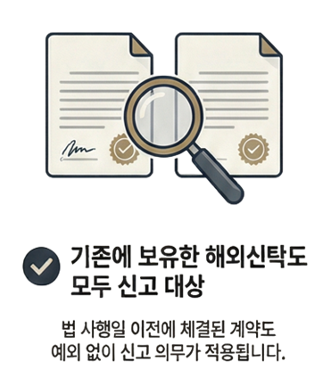 개정법 시행일(2025. 1. 1.) 이전에 이미 해외신탁계약을 체결하여 유지하고 있는 경우라도 대통령령으로 정하는 바에 따라 해당 현황을 신고하도록 규정하였습니다.