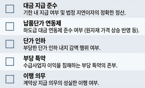 이에 기업으로서는 ① 대금의 기한 내 지급 및 법정 지연이자의 정확한 정산 여부, ② 하도급 대금 연동제 준수 여부, ③ 단가의 부당 인하 내지 감액 여부, ④ 부당 특약의 존부, ⑤ 지급의무 이행 여부 등 주요 불공정행위 유형에 대한 사전적 점검 및 내부 컴플라이언스 정비를 통해 이에 대비할 필요가 있을 것으로 판단됩니다.