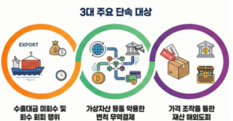 올해 관세청은 외환조사 분야에서 환율의 안정을 저해할 우려가 있는 불법적인 외환거래 단속을 중점 업무방향으로 설정하고, 상시 집중 단속을 실시합니다. 주요 단속대상은 ▲법령을 위반한 무역대금 미회수부터 ▲가상자산 등 대체수단을 악용한 변칙적 무역결제 ▲무역악용 외화자산 해외도피 등 3가지 무역·외환 불법행위입니다.