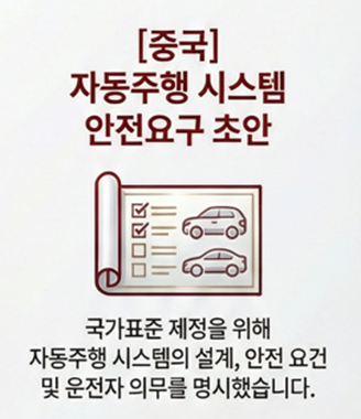 2026. 2. 중국 공업정보화부는 「지능형 연결자동차 자동주행 시스템 안전요구」 의견수렴안을 공개하였습니다. 해당 문서는 국가표준 제정을 전제로 한 초안으로, 자동주행 시스템의 설계 및 안전요건을 규정하고 있습니다.