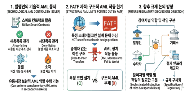 이번 보고서는 스테이블코인 발행인이 스마트컨트랙트 기능을 통해 일정 수준의 기술적 통제수단을 보유할 수 있다는 점도 언급합니다. 허용목록 관리(allow-listing), 차단목록 관리(deny-listing), 동결(freeze), 소각(burn) 등이 그 예이며, 발행인이 유통시장에서도 보완적인 AML 역할을 수행할 수 있다고 제안합니다.