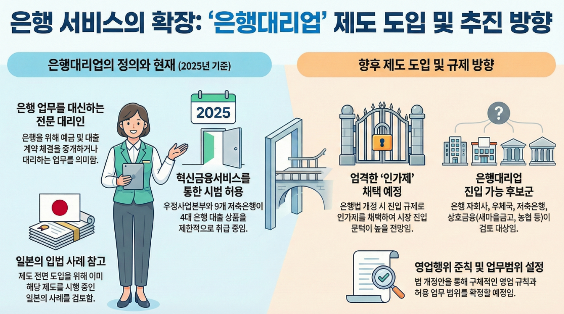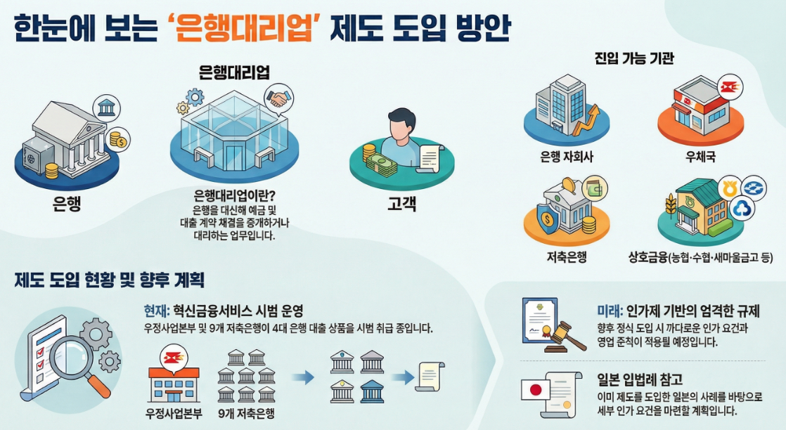 2025년 6월 출범한 이재명 정부의 국정기획위원회는 금융 부문의 국정과제의 하나로서 은행대리업 제도의 도입 방안을 제시하였고, 이에 따라 금융당국인 금융위원회는 은행대리업 제도를 도입하기 위해서 관련 법률인 「은행법」 개정을 올해 추진할 계획입니다. 은행대리업 제도를 도입하는 이유는 최근 비대면 은행거래가 많아지면서 많은 은행 점포가 폐쇄되고, 이에 따라 은행창구를 이용하는 고령층 등 전자금융거래 소외계층이 은행업무에 접근할 수 없는 문제를 해결하기 위한 것입니다.